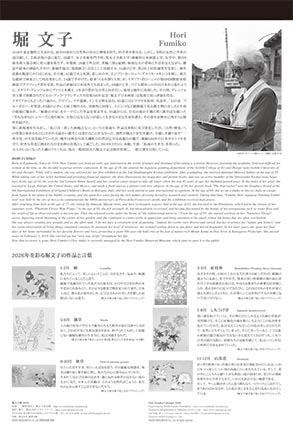 2025年暦より堀文子氏の紹介ページをリニューアルし、英訳が加わりました。今回も作品に合わせた堀文子の言葉を掲載しています。堀文子監修のデザインそのままに、四季折々の草花を一年を通してお楽しみ下さい。